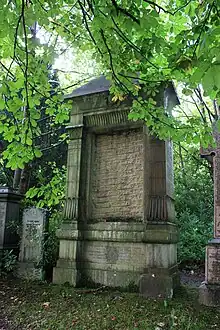Sellars was married to Jane Moodie (1844-1927). He died on 9 October 1888 of blood-poisoning contracted from a nail piercing his boot whilst on site.[2] Sellars is buried in Lambhill Cemetery with his monument by his colleague John Keppie sculpted by his friend James Pittendrigh Macgillivray whom he worked with on several projects. The grave sits on axis with the main east–west path at its western end, but is set behind more modern graves and partially obscured by trees. It was originally the focal point of the main path. The main inscription panel is missing.