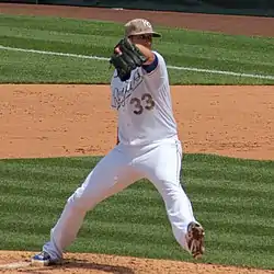 Shields was selected as an All-Star for the first time in his Major League career in 2011.[8] He was named the 2011 Tampa Bay Rays team MVP by the Tampa Bay chapter of the Baseball Writers' Association of America, compiling a 16–12 win–loss record, 2.82 ERA, a career-high 225 strikeouts, and a team-record 11 complete games.[20] The 11 complete games earned him the nickname "Complete Game James" among fans and local media.[21] Shields also finished 3rd in the American League Cy Young voting.[22]