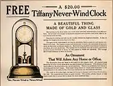 By January 1907, Van Inwagen had moved to New York City, where he was the president of the Tiffany Electric Manufacturing Company[17] Among the products manufactured by the company were never-wind electric clocks. By 1912, Van Inwagen had moved the company to Buffalo, New York.[18] By 1918, some seven models were offered. Though fairly expensive, the "Tiffany Never-Winds" enjoyed success.[19] [20] Van Inwagen was still with the Tiffany Electric Manufacturing Company in 1919.[21]