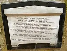 Walker continued to receive employment despite the end of the wars with France and America, commanding in turn the 74-gun ships HMS Albion, HMS Queen and HMS Northumberland, paying off Northumberland on 10 September 1818.[1] He was nominated a Companion of the Bath on 4 June 1815, and was promoted to rear-admiral on 19 July 1821.[1][12] Walker was reportedly a cheerful and friendly officer, who won respect through his leniency and good nature. His commanding officer, William Young, once complimented him for keeping Bedford in a state of high discipline without once resorting to a flogging over a period of five months and three weeks.[1] While in command of the Northumberland he was praised for his actions when he and his crew fought a fire that had broken out in Sheerness Dockyard, and which had threatened to destroy the entire yard.[17] James Walker was twice married, at first to a daughter of General Sir John Irwin, Commander-in-Chief, Ireland. The marriage did not produce any children and after her death Walker married Priscilla Sarah, the fourth daughter of the MP Arnoldus Jones-Skelton.[12] The couple had three sons; the eldest, Melville, entered the army, while the two younger sons, Leven Charles Frederick[18] and Thomas, followed their father into the navy.[19] Rear-Admiral James Walker died at Blatchington, near Seaford, Sussex on 13 July 1831 at the age of 67, after a short illness.[1][12]