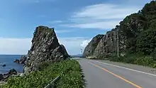 The JR Gonō Line closely parallels the highway for much of its route. Also known as the Ōmagoe-kaidō,[2] there are several attractions along the winding coastal portion of the highway including Furofushi Onsen and the World Heritage Site, Shirakami-Sanchi around the border between Aomori and Akita prefectures.[3] The registration of Shirakami-Sanchi as a World Heritage Site has resulted in an increase in the average daily traffic levels along the highway.[4]