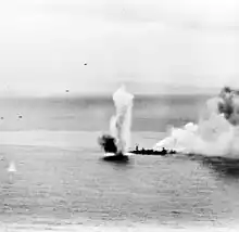 On 22 October 1944, Yahagi was in the Battle of Leyte Gulf in the Second Section of Force "A" of Vice Admiral Takeo Kurita's First Mobile Striking Force: (Center Force), commanding DesRon 10's DesDiv 2's Kiyoshimo, DesDiv 4's Nowaki and DesDiv 17's Urakaze, Yukikaze, Hamakaze and Isokaze. She was accompanied by battleships Kongō and Haruna and cruisers Tone, Chikuma, Kumano and Suzuya. During the Battle of the Sibuyan Sea on 24 October 1944, the fleet endured 11 raids by over 250 Task Force 38 carrier aircraft from the USS Enterprise, Essex, Intrepid, Franklin, Lexington and Cabot. Although the battleship Musashi was sunk and Yamato and Nagato were hit, Yahagi was unscathed.[5]