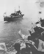 Hamakaze was heavily involved in the fighting in 1943 in the Solomon Islands chain, including the battles of Kula Gulf, Kolombangara, and the 'Battle off Horaniu'. On 7 April 1945, Hamakaze escorted the battleship Yamato from the Inland Sea on her Operation Ten-Go attack on the Allied forces on Okinawa. She was sunk by aircraft of Task Force 58 and sank 150 miles (240 km) southwest of Nagasaki (30°47′N 128°08′E / 30.783°N 128.133°E).[4]