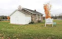 The school is constructed primarily of local fieldstone. The original blackboards were made of painted wood. Originally, there was a small wood entrance. It was replaced in 1941 with the larger brick entrance which remains today. This new entrance featured Kaustine septic toilets which replaced the outhouse out back. The wide board in the back which served as a place for hooks for coats and such was replaced by hooks in the new entrance. The inside of the schoolhouse, though it was in near ruins for a long time, has been restored to something fairly representative of what it might have looked like for most of its history. Also, the space used to be heated by a box stove which sat on a brick foundation in the center of the room. This stove is no longer there. Prior to the 1930s, there was no electricity in the schoolhouse.