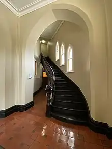The main façade of the building is made out brown stone that is obtained from the regions of Queenstown.[11] The stone is laid unevenly with a pattern that varies in different shades of browns and dark yellows. The material used for the roof is Canadian slate. The roof is constructed from a series of pitched segments that are centrally connected by a horizontally sliced dome. There are eight entrances, each consisting of solid oak double doors framed with pointed sandstone arches. Several of these doors have been blocked off with black cast iron gates. Triangular sets of small rosette windows are placed above every door to fill the space in between the entrance and the top of the arch. The building has number of columns with slim tall shape and different capitals that are loosely based on a Corinthian order. The capitals are made of gray stone while the columns are of a high quality bronze shaded granite found in St. George, New Brunswick.[11] The main entrance is set under the only tower of the building facing the south west side which serves as a vertical axis to the building. A copper spire sits on top of the tower, adding approximately nine metres (30 ft) to the existing roof height. In addition to the vertical axis the building also has a horizontal symmetry axis that goes diagonally through the building. The flat-roofed extension of the church, built after the 1938 fire, was constructed with red brick masonry which contrasts with the charred Queenston façade.