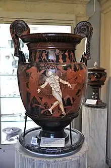 The second room, the largest, contains about 700 vases of Greek or local production.[3] The vases were created with the technique of red figures, or red images on a black background.[3] At the entrance to the room it is possible to admire a large crater with masks from the 4th century BC. depicting Apollo in the act of shooting arrows at the Niobids, the work of the Baltimore Painter.[12] The vase is flanked by two amphorae from the same period but by the painter Lycurgus: the first bears the scenes of Heracles in the temple with Antigone and Creon and of the fight between Amazons and warriors around Heracles; the second, instead, the delivery of weapons to Achilles by the Nereids. Noteworthy is the Attic bell-shaped crater depicting the rise of Heracles to Olympus.[13]