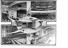 The stage features an ornate proscenium arch with a beautiful mural by William Peaco of Chicago, whose work was featured in many public buildings in the Midwest.
