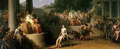 As well as relatively informal portraits, he specialized in ambitious history paintings of subjects from ancient, especially classical, history. These are in a Neoclassical style, several with large groups of figures, inevitably drawing comparison with the works of his contemporary Jacques-Louis David, who was four years older.[3] But many of Saint-Ours's works are far smaller, if only because he lacked the commissions to realize them at the full sizes he intended. His major compositions mostly exist as drawings with various degrees of finish, small painted versions and, if he received a commission, the full-size oil paintings, which can often be very large.