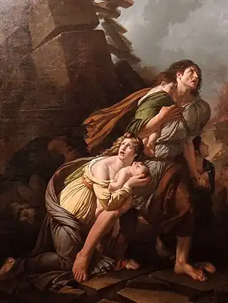 The later versions of his Earthquake, where a family flee from a collapsing Greek temple, show his disillusion with the Revolution and its Napoleonic aftermath; altogether he painted five versions of the subject between 1782 and 1806.[14]