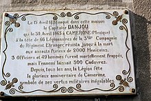 The inscription reads: On April 15, 1828, in this house was born Captain DANJOU who on April 30, 1863, in Camaron (Mexico), at the head of 66 legionaries of the 3rd Company of the Foreign Regiment, resisted until death the furious assaults of 2000 Mexicans. 3 officers and 49 men were fatally wounded, but the enemy left 300 corpses. Since then, every year, the Legion celebrates the glorious anniversary of Camerone, symbol of its unrivaled military virtues. Photo Jules Rhin.