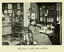 Disliking the occupational options commonly open to women, she instead started working as a researcher for a historian during the Civil War before turning to the periodical industry.[3] From 1869, she was connected with various newspapers in Newark and New York. She began newspaper work in the editorial department of the Newark, New Jersey Morning Register, then conducted by her brother, Richard, and was also the Newark reporter for New York Tribune.[1] She was the New York correspondent of the Transcript;[5] and also worked for the Boston Evening Transcript, where she used the pen name "Brunswick". Gilder became literary editor for Scribner's Monthly before becoming a drama and music critic for the New York Herald until 1880.[1][2]