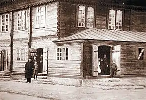 There is general agreement that German secret police or intelligence officials were seen in Jedwabne on the morning of 10 July 1941, or the day before, and met with the town council.[40] Szmuel Wasersztajn's witness statement in 1945 said that eight Gestapo men arrived on 10 July and met with the town authorities.[15] Another witness said four or five Gestapo men arrived and "they began to talk in the town hall". "Gestapo man" was used to refer to any German in a black uniform, Persak writes. The witnesses said they believed the meeting had been held to discuss murdering the town's Jews.[lower-alpha 1]