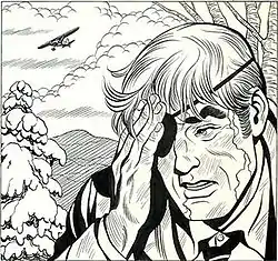 Afterwards, he returned to Toledo and stopped by to see Steve Roper authors Allen Saunders and Elmer Woggon; he had met them as a student cartoonist and had been sending them additional sketches during the war.[3] Liking his work, Saunders hired him as a new ghost for Woggon because Publishers Syndicate had complained that the artwork still looked too cartoonish for an adventure strip.[4] The strip continued to appear as "Steve Roper by Saunders and Woggon." Hoffman's name was seen only in the sequence of June 9–14, 1947, when Roper's friend Sonny Brawnski wrestled "Poison Pete Hoffman" after threatening to throw him into Toledo's Maumee River.