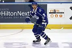 On August 15, 2005, Tambellini signed an entry-level contract with the Kings, foregoing his senior year with Michigan.[11] In late-September, he was assigned to their American Hockey League (AHL) affiliate, the Manchester Monarchs, following his training camp with Los Angeles.[11] Two months into the season, Tambellini was called up to the Kings,[11] making his NHL debut on November 30, 2005, against the Chicago Blackhawks.[12] The Kings lost the game 3–2, while Tambellini earned nine minutes of ice time.[12] After four pointless NHL games, he was sent back down to Manchester.[11] On March 8, 2006, Tambellini was traded by the Kings, along with defenceman Denis Grebeshkov, to the New York Islanders, in exchange for forward Mark Parrish and defenceman Brent Sopel.[11] Upon being dealt, he was called up from the AHL and played the remainder of the season with New York. He left Manchester with 25 goals and 56 points in 56 games, which finished the 2005–06 AHL season ranked as the third-best points-per-game rate among league rookies.[13]
