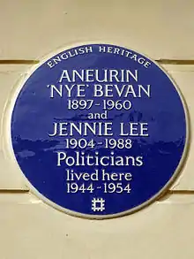 An English Heritage plaque in 23 Cliveden Place, Chelsea, London, celebrates Nye Bevan and Jennie Lee.