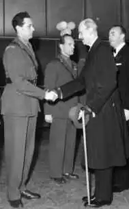 ![]() Jens-Anton Poulsson shaking hands with King Haakon VII at the release of the 1948 film Operation Swallow: The Battle for Heavy Water | |