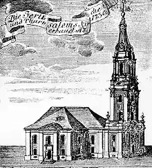 Frederick William I of Prussia commanded on 1 November 1725 to build the church building, the foundation stone was laid on 27 November 1727 and since 1728 has been built on the church building.[7] In 1728–1731 Philipp Gerlach replaced the old structure including the sepulchre chapel by a new church building, whose southerly tower had a wooden top, which – poorly built as it was – had to be torn down again in 1747. The tower then remained a stump.[8] Due to the position of the site in the middle of a crossroads with streets entering from five directions the quire of the church was not oriented, but directed to the north.[9]