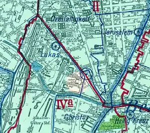 A certain Müller, a burgher of Berlin, endowed a chapel in gratitude for his lucky rescue from a Saracen assault during his pilgrimage to Jerusalem. On 18 October 1484 Arnold von Burgsdorff, Prince-Bishop of Brandenburg, issued an indulgence, promising all those helping to restore the chapel 40 days less in the purgatory.[1] The indulgence is the oldest surviving document mentioning the chapel, then consecrated to Mary(am) of Nazareth, the Holy Cross, Pope Fabian, and Sebastianus of Narbonne.[2] The chapel was then located in the fields about 1 km outside of St. Gertrud's Gate (close to today's Gertraudenbrücke) of the city of Cölln (a part of today's borough Mitte of Berlin) on the highway to Magdeburg and Leipzig (today's Axel-Springer-Straße and Lindenstraße).