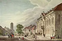 View in 1850 from the Collegiengebäude (Brandenburg Consistory and Kammergericht joint office building) northeastwards through Lindenstraße towards the tower stump of Jerusalem Church before its refurbish in 1878.