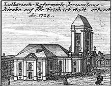 Jerusalem Church (German: Jerusalem(s)kirche, Jerusalemer Kirche) is one of the churches of the Evangelical Congregation in the Friedrichstadt (under this name since 2001), a member of the Protestant umbrella organisation Evangelical Church of Berlin-Brandenburg-Silesian Upper Lusatia. The present church building is located in Berlin, borough Friedrichshain-Kreuzberg, in the quarter of Friedrichstadt. Jerusalem Church is fourth in rank of the oldest oratories in the town proper (except of suburbs incorporated in 1920, which are partly older).