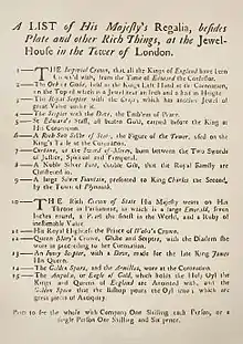 Drastic changes followed: an armed guard was provided, the collection was put behind bars in a windowless room, and the first guidebook to the Crown Jewels was published, formally establishing it as a visitor attraction. People were locked inside the tower during their visit and only permitted to see the jewels from a distance. For a small fee, they could reach through the bars and touch some of the jewels.[1][2]