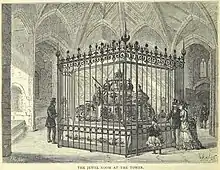 In 1815, a female visitor (later found insane) grabbed the State Crown and pulled it to bits, causing more than £10 worth of damage.[1] This and the poor quality of the keeper's live-in accommodation led to an overhaul in 1816. A rail was installed to keep the public at a distance from the jewels, and the repaired State Crown and Exeter Salt were put in glass cases on revolving tables. The whole collection was lit by six powerful argand lamps.[3]