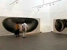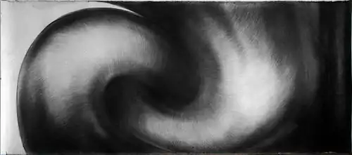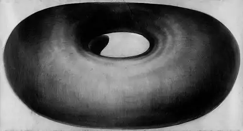 This shape also offers the possibility of mathematical transformation, during which the whole object can be turned inside out through eversion (like From nowhere to nowhere, 1990-7), to work in a 4D space and to decrease the central space through shortening of the axis, leading to final degeneration into a sphere. (It, charcoal on cardboard, 220 x 480 cm, 1989–92).