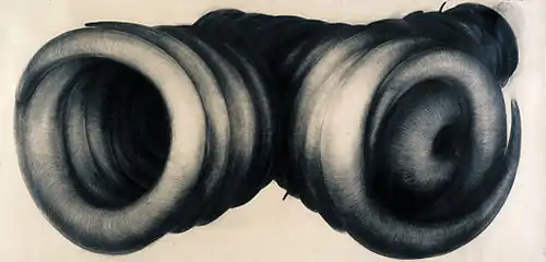 Giant objects from the beginning of the 1990s offer perfect spatial illusion of voluminous figures of organic shape (And out/aerial meditation, charcoal on cardboard, 220 x 500 cm, 1990–92, It, charcoal on cardboard 220 x 480 cm, 1989–92). The time range of their creation bears witness to how technically demanding these drawings are.