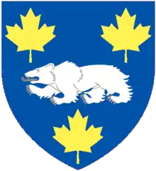 A demi springbok Azure horned and gorged with a collar of twelve maple leaves (six visible) Or bearing between its forelegs the baton of office of the Deputy Herald Chancellor of the Canadian Heraldic Authority Proper.