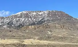 The mountain is situated 20 miles (32.2 km) west of the town of Cody and can be seen from Highway 20 approximately midway between Cody and Yellowstone National Park. It is set in the Absaroka Range along the boundary of North Absaroka Wilderness on land managed by Shoshone National Forest.[2] Precipitation runoff from the mountain drains into tributaries of the Shoshone River. Topographic relief is significant as the south aspect rises 4,830 feet (1,470 meters) above North Fork Shoshone River in four miles (6.4 km) and the east aspect rises 2,000 feet (610 meters) above Jim Creek in one mile (1.6 km).