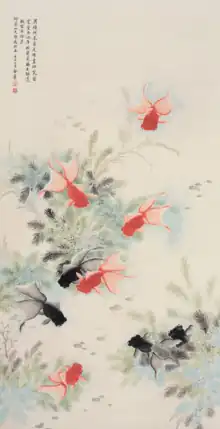 Jin Zhang married Wang Jizeng (1882–1955) in 1909 when she was twenty-five. She and her husband briefly lived in Paris, France for several years in the early 1910s, where he worked in education.[5] The pair hosted her brother Jin Cheng on his 1910–1911 diplomatic trip to Paris on behalf of China.[2] The couple had at least two children: a son named Wang Shirong who was born in 1912 but died prior to 1920, and a son named Wang Shixiang who was born on 25 May 1914.[6] Inspired by his parents, Shixiang would eventually become a well known researcher and art collector.[7] In 1999, he authored a 116-page book on his mother's life and artistic career titled Jin Zhang: The Joy of Goldfish.[8]