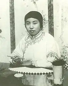 Jin Zhang was born in 1884 in the town of Nanxun in China to a prominent silk merchant family. Her grandfather founded a successful silk business that her father, Jin Dao, was able to expand internationally. His openness to foreign ideas led to his children growing up alongside popular Western inventions like microscopy, phonography, and the camera.[1] Jin Zhang had several brothers and sisters, one of whom became Republican cultural leader Jin Cheng (1878–1926).[2] One of her younger brothers, Jin Shaoji, co-founded the Peking Laboratory of Natural History in 1925 with American Amadeus William Grabau.[3]