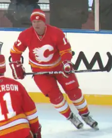 The Calgary Flames selected Hrdina with their eighth round selection, 159th overall, at the 1984 NHL Entry Draft.[1] However, due to a Czechoslovak policy at the time regarding national team players, he was not permitted to join a professional team until after the 1988 Winter Olympics.[2] Hrdina joined the Flames at the Games' conclusion, and made his NHL debut, as a 30-year-old, on March 3, 1988. He recorded his first point, an assist, in that game, then scored his first NHL goal on March 15 against the Hartford Whalers.[1] He appeared in nine games to end the 1987–88 season with Calgary and scored two goals and seven points.[3]