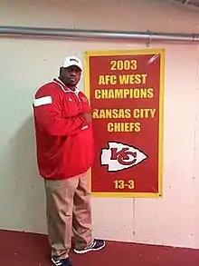 Hall finished his education in April 2003, and immediately after signed a contract with the Kansas City Chiefs.[3] Upon joining the Chiefs, he weighed 318 pounds as a fullback, being described by head coach Dick Vermeil as "catch[ing] my eye every time I come onto the field."[32] Although Hall impressed in training camp and in preseason,[33] he ended up being released at the final roster cuts on September 1.[34] He was later brought back as a member of the practice squad.[35] Hall spent the entire 2003 season as a practice squad player, as the Chiefs went 13–3 in the regular season, before losing to the Indianapolis Colts in the playoffs.[36][37]