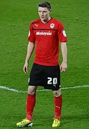 On 8 July 2011, Championship side Cardiff City agreed a £250,000 transfer fee for Mason.[10] Two days later the deal was completed and he signed a three-year deal with the Welsh club.[11] Mason made his debut for Cardiff in a 1–0 win at West Ham United on 7 August 2011, replacing Craig Conway as a second-half substitute.[12] He made his first start on 17 August in a home match against Brighton & Hove Albion,[13] which Cardiff lost 3–1.[14] Mason scored his first goal for the club on 22 October, in a 5–3 victory over Barnsley.[15] His next goal came three days later in the League Cup, the goal against Burnley meant that Cardiff reached their first League Cup quarter final since 1965.[16] Mason scored his fifth goal of the campaign in a 3–1 win at home to Reading on 2 January 2012.