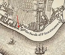 In 1675 Gascoyne set up in business for himself at "Ye Signe of ye Platt neare Wapping Old Stayres three doares below ye Chapell" (arrow), taking apprentices of his own and producing manuscript and engraved charts.[1]