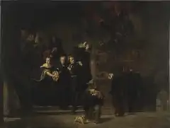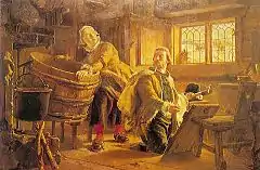 Höckert traveled to the Netherlands in 1856 to study Rembrandt. He returned to Paris the same year and made another popular painting: Det inre af en lappkåta (English: The inside of a goahti).[5] This painting depicts a Lappish mother wagging her child in their goahti home. It was awarded with a mention honorable at the Paris Salon in 1857,[3] and was bought by the Swedish government to be displayed at the National Museum of Fine Arts.[5] In 1862, it was displayed at the World's Fair in London.[3]