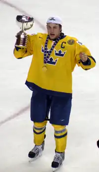 ![]() Larsson celebrates after winning the 2012 World Junior Hockey Championship. | ||
