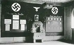 After the fascist takeover in 1933, the school system had been reorganized. In the spirit of the National Socialism and therefore the community, all school types supporting self-determination were abolished. The Bernsdorf School was reorganized and became a board school but still separated girls and boys. Everyday school life was influenced by the ideology such as the, "Führer principle" and unquestioning obedience. The Parents Council did not have much influence anymore and the youth associations, Hitlerjugend and Bund Deutscher Mädchen, were included in the school system. The regime tried to unionize teachers in the "National-sozialistischen Lehrerbund". They were trained politically and informed about the changes in the school system. Non-Aryan teachers had been suspended as well as teachers were forced to become members of the NSDAP. The interior design was changed and walls were decorated with Nazi symbols, photos of Adolf Hitler, the Reich's flag, and National Socialist publications. Some of the wall decorations were part of an exhibition that changed on a regular basis.
