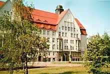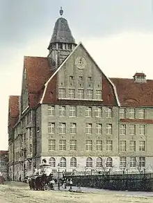 The city council advertised a competition for planning and designing the new building. 104 concepts were turned in and the design "Fritz und Elly" by the architects Adolf Alfred Christian Zapp and Erich August Leo Basarke persuaded the jury the most. They received a prize of 3000 marks. The architect's office was put in charge of building the schoolhouse by signing the contract on 3 February 1909. They planned to finish construction work around Easter 1910.[9] Having cost more than 750,000 marks, the school was inaugurated on 25 April 1910. 846 girls and 1345 boys enrolled and started school the next day.[10]
