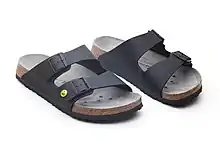 The Birkenstock brand traces its roots to Johann Adam Birkenstock, registered in 1774 as a "vassal and shoemaker" in local church archives in the small Hessian village of Langen-Bergheim. In 1896, Johann's great-great-grandson Konrad Birkenstock developed the first contoured insole for use by shoemakers in the production of custom footwear.[2][3] Also in the year 1896, Konrad created the Fussbett (footbed) and opened two shoe stores in Frankfurt, Germany, where he continued to make and sell his insoles.[4][5] The Birkenstock company created many educational courses to help spread awareness of the benefits of its shoes; in 1947, Konrad's son, Carl Birkenstock, wrote the book "Podiatry-The Carl Birkenstock System"—one of many books released by Birkenstock. The year 1902 saw the development of the first flexible arch-support for insertion into factory-made shoes, and in 1964, Karl Birkenstock developed these inserts into a shoe — thus producing the original prototype of the Birkenstock sandal. In 1925 Konrad Birkenstock expanded the company by buying a large factory in Friedberg, Hesse. After World War II (1939–1945), the Birkenstock sandal was popular among returning soldiers because of the orthopedic support.[6] Starting in 1963 and continuing into 1964 Karl Birkenstock released his first athletic sandal with a flexible footbed called Madrid. The shoe was constructed so that the wearer would have to grip their toes to keep the sandals on; this resulted in toning the calf muscle,[7] which became quite useful to athletes, especially among gymnasts.[8]
