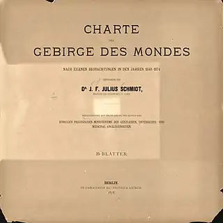 Charte der Gebirge des Mondes, as it is known, was finished in 1874. Julius Schmidt presented the chart at the Berlin Observatory in December of that year. This was the first map of the Moon to surpass the celebrated Mappa Selenographica of Beer and Mädler.