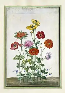 This was an era when the purpose of a florilegium was to serve as a pictorial catalogue of a garden, and correspondence shows that the Count invited Walther to Idstein near Frankfurt to spend the spring and summer months there to paint flowers and fruits from the garden - Walther did so on at least eight occasions between 1654 and 1674. The paintings were bound into anthologies of which only three versions are known - one at the Victoria and Albert Museum in London has 133 flower studies and a number of views of the garden that are painted on paper and bound in two volumes, another at the National Library of France, a codex of 54 gouaches on parchment, and the final set at the Städel Museum in Frankfurt am Main which has two volumes of the Florilegium with 130 gouaches of flowers on parchment.[4]
