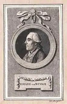 Wunsch was born on 22 December 1717 in Heidenheim, Württemberg to a furrier and died at Prenzlau, in the Kingdom of Prussia on 18 October 1788. His grandfather served in the Austrian military, and his father had served for a few years in the Bavarian military.[3] He received schooling locally, and on his eighteenth year, his father sent him to Officer Cadet training in the Duke of Württemberg's Regiment.[4] While with this regiment in Vienna, he married Josephine le Roi, the daughter of a Habsburg War Commissary. They had one son.[1]