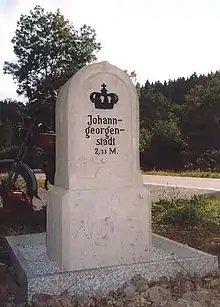 Johanngeorgenstadt was included in the postal road system of the Electorate of Saxony as the town lay on a pass in the Ore Mountains. Hearkening back to this time are the postal milestone from 1728 before the post office in the New Town (Neustadt), although originally it stood at the marketplace, and also a full milestone opposite the powder tower and a quarter-mile stone in Steinbach, both of which date from 1725. There are furthermore several Kingdom of Saxony milestones near the town that were placed from 1858 onwards, for example on the old postal route from Auerbach by way of Carlsfeld and Wildenthal (today part of Eibenstock) to Johanngeorgenstadt.