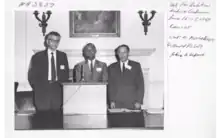 Conference on the Archives of United States Foreign Relations, July 16–17, 1969. Pictured standing together from left to right are: Dr. Morris Rieger, Dr. Harold T. Pinkett and John A. DeNovo.