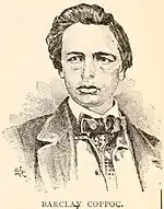 • Edwin Coppock 24, shot and killed the mayor of Harpers Ferry, Fontaine Beckham, during the raid. He had been with John Brown in Kansas.[67] He was visited in jail by "three Quaker gentlemen from Ohio, with whom he had lived in his boyhood, and an uncle, from the same State."[68]:80 One newspaper report says that his body was sent to his mother in Springdale, Iowa,[69] another that it was sent to a Thomas Winn in Springdale,[63] accompanied by his uncle, "a highly esteemed old Quaker gentleman, who did not sympathize in the least with the misguided and errant young man, and by him [the body was] conveyed to the home of his afflicted mother."[63] A different report says that the Quaker was not a relative, but someone who took him in when he became an orphan.[67][31]:27