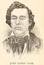 • John Edwin Cook, sometimes spelled Cooke, 29, born in Haddam, Connecticut,[70] but was from Pennsylvania.[13]:24 He had been a teacher.[71] He was Brown's second in command, by one report,[72] had been with Brown in Kansas,[7]:6 and had lived undercover for over a year in Harpers Ferry.[7]:2 He was described as "a man of some intelligence",[72] "a quick-witted, intelligent man",[73] from a good family, who had studied law and taught school.[74][75] He escaped into Pennsylvania after the raid, but Governor Wise offered a reward of $1,000,[76] and he was soon captured.[77][78] His attorney at the time, Alexander McClure, published lengthy recollections.[79] A band played as he was taken from the jail in Chambersburg to the train that would take him to Charles Town for trial.[80]