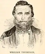 † William Thompson, 26, mortally wounded during the raid[36] William Thompson, from North Elba, New York, was brother of Adolphus. They were brothers of Henry Thompson, who was married to Ruth, John Brown's eldest daughter.[7]:7 First buried in one of two unmarked boxes near Harpers Ferry; re-interred in 1899 in a common coffin in North Elba.