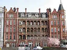 Success brought initially the need for subsidiary sites around London, and then from 1822 a move to premises south of the river, at the junction of Waterloo Road and Stamford Road. The new name was Royal Universal Infirmary for Children, with a foundation stone laid in 1823. Davis's death in 1824 came shortly before the new building was completed. The character of the institution changed in 1856, with annual donations from the Hayles Estate charity (see Walcot Foundation): it admitted inpatients for the first time, and its title increased its scope to "Children and Women".[7] Two further name changes were to Royal Hospital for Women and Children in 1875, and in 1903 when the rebuilt building became he Royal Waterloo Hospital for Children and Women.[8]